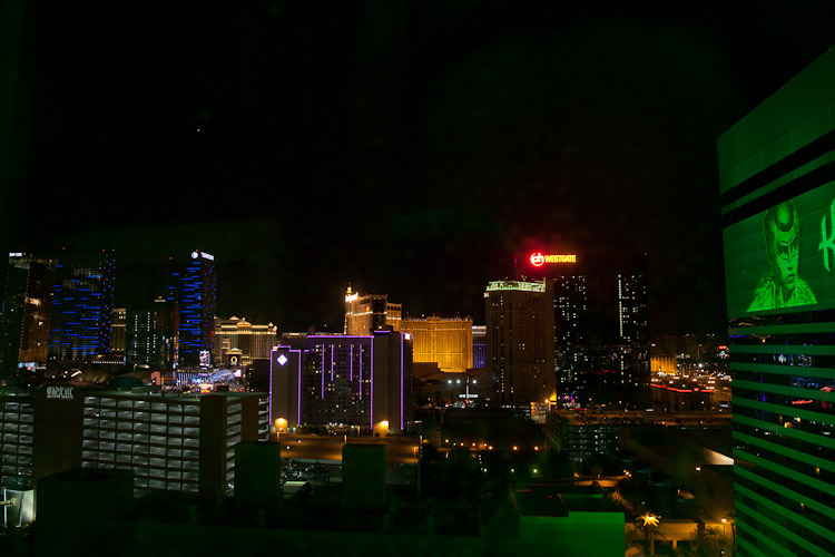 Einchecken war auch streßfrei und hatte dern erfreulichen Effekt, dass ich – warum auch immer – für die Internet-Nutzung im Hotel, die sonst 15 $/Tag kostet (!), nichts bezahlen muss. Naja, und ich habe ja für 20 $ Aufpreis ein Zimmer mit Strip-View genommen, und das ist schon recht nett (22. Stock):